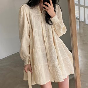 Simple Temperament Lapel Folds Feeling Loose Single-breasted Puff Sleeve Short Doll Skirt