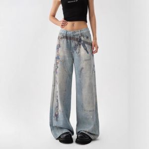 Women’s American-style Retro 3D Printed Washed Wide-leg Pants