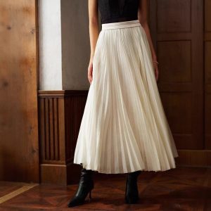 Elastic Waist A- Line Dress White Pleated Casual Skirt